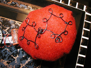 Yep, another altered pincushion spoon! This time I used my Wig-Jig to make the top design and sewed it right through the whole pincushion. Along the handle I used the square knot technique on 24 gauge bendable wire, from my Hemp Happy macramé book. Aaaannd ~ say it with me! My Glue Gun is my Friend!